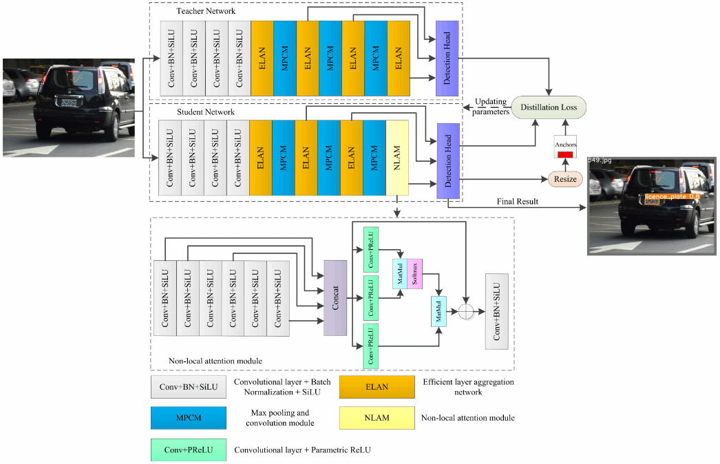 IEEE Transactions on Intelligent Vehicles (SCI-IF:8.2): Knowledge Distillation with Fast CNN for Licensee Plate Detection (作者中文名:田春伟,张璇昱,梁旭,李波,孙友刚、张师超)提出了一种基于知识蒸馏快速CNN车牌检测方法,该方法利用孪生YOLOv7来实现轻量级的知识蒸馏网络并结合非局部相似性机制来引导卷积神经网络,快速地检测车牌位置。