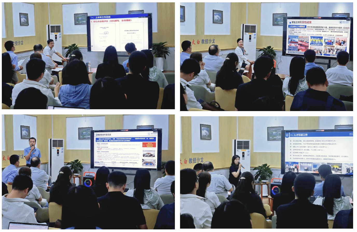 随后,学院各分管领导依次汇报工作。副院长马春燕就教学工作进行了梳理,通报了2025年教材建设、教学成果奖、高水平大赛等“目标责任制”完成情况,从智慧课程建设、教材建设、名师培育、竞赛、思政课程等方面,提出了一系列切实可行的推进计划;副院长郭培荣全面总结了上半年科研工作取得的突破与进展,明确了下半年学院科研攻关“揭榜挂帅”项目推进、科研团队(小组)建设、科研项目申报、保密管理、安全生产工作等重点工作;党委副书记陈博聚焦党建与学生工作,回顾了党建、创新竞赛、共青团工作、学生深造、就业工作、河北招生工作等方面的工作成效,并对新学期重点任务作出了部署;院长助理张凯龙围绕国际化推进工作,总结了引智资源平台建设、优质海外教师引进、国际联合培养、学生出国境交流等方面的成果,并明确了下一步拓展国际合作的目标与路径;办公室主任王宇英就人事与人才工作汇报了人才引进、青年教师培育、人事管理等方面的进展,对下半年人才项目申报、制度与平台建设等重点工作作出了安排。