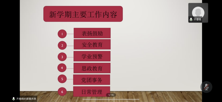 最后,齐老师对本学期的主要工作安排进行讲述。新学期工作内容主要从安全教育、学业预警、日常管理等方面开展。由于目前疫情情况还不稳定,齐老师提醒大家日常要做好防护,每日安全健康报,务必配合学校,按时认真填写;对于上学期挂科的同学,要提早准备复习,及时关注补考信息,并建议每个班组织集体晚自习,方便大家互相监督,共同进步;最后,齐老师告诉大家一定要学会独立思考和解决问题,尤其是生活和学习上的基本问题,自己要主动积极向身边的同学请教,多与人交流,在交流中学习,在学习中成长。