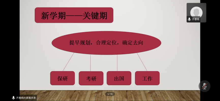 其次,齐春晓老师进行自我介绍,由于工作岗位调整,日后将负责2018级本科生管理工作。齐老师强调,大三是至关重要的一年,是一个重要的分水岭,同学们将面临四种选择:保研、考研、出国和就业。在这个阶段同学们一定要给自己做出规划和清晰的定位,提早进入状态。此外,齐老师也将往届本科和研究生毕业生的就业宝典分享给学生,以供同学们借鉴学习。
