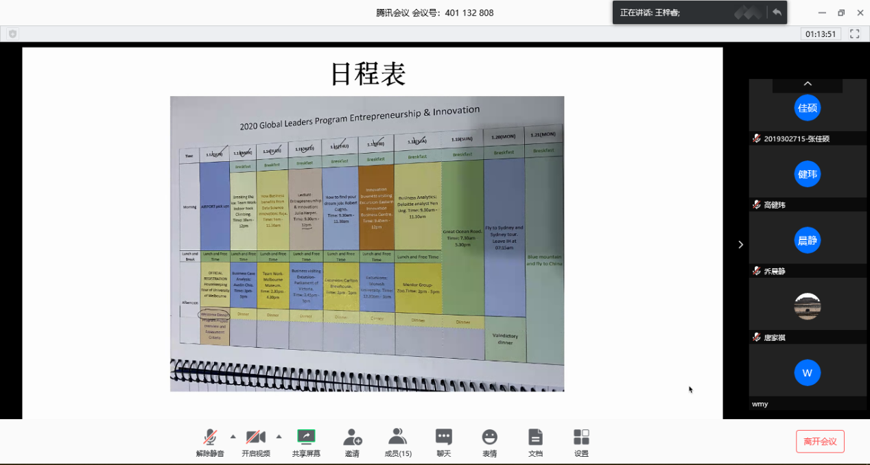 来自玛丽女王工程学院材料科学与工程专业的大三同学赵景城通过许多团队精心剪辑的视频向大家展现了自己的所感所想。他提到在项目中学员上午接受由澳洲企业家、企业高管以及墨尔本高等院校老师的授课,与老师同学们就枫林网、创新等话题展开深入讨论,下午则由墨大的学生带领奔赴澳洲多家资深企业深入实地参观学习,为丰富同学们的课余生活,项目还组织大家在专业人士指导下进行室内攀岩,大洋路游览,参观博物馆,游览动物园等。