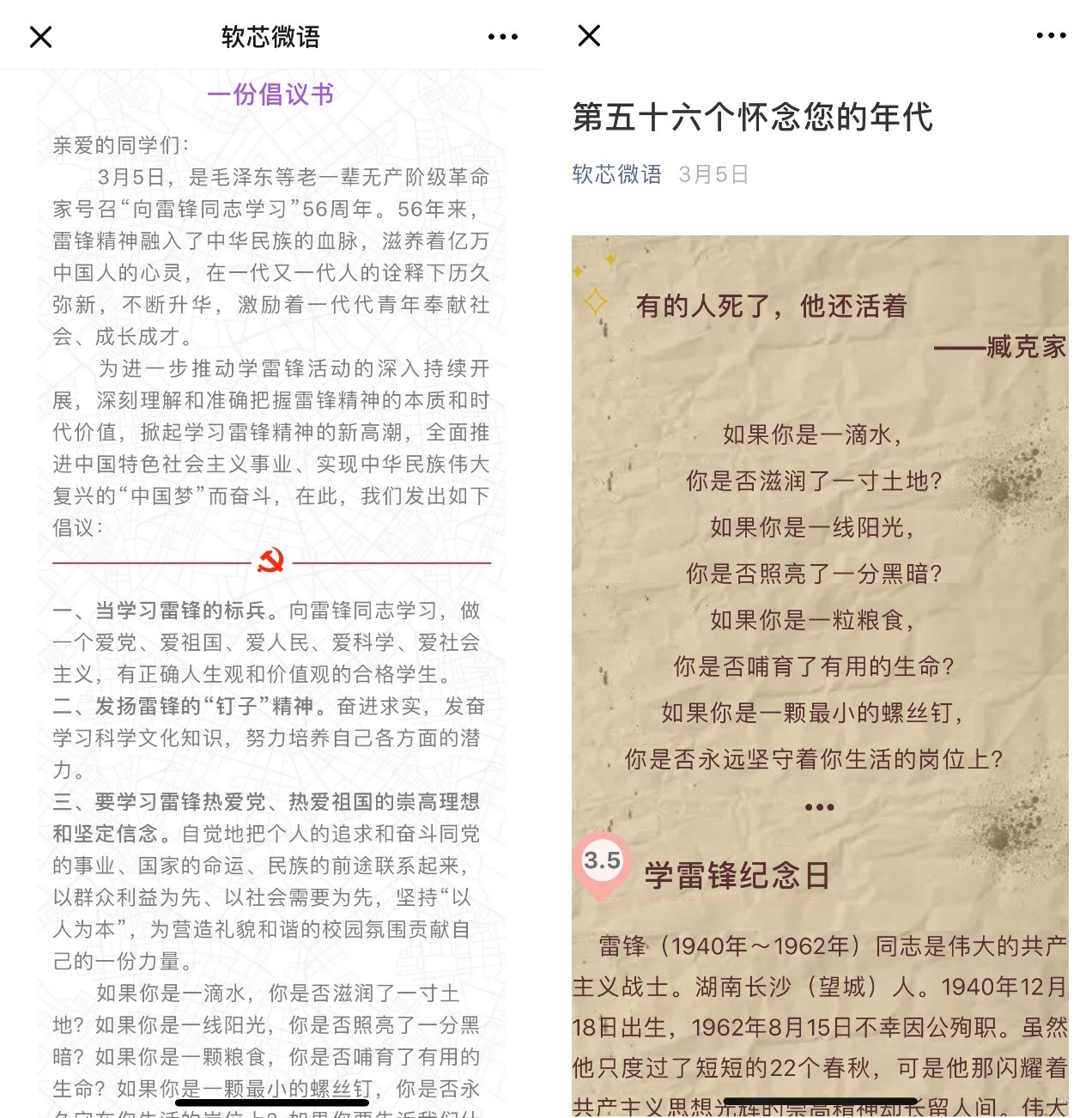 35,软件与微电子学院团委、软件与微电子学院学生会、牵手志愿者协会在微信公众号“软芯微语”发起一份倡议,鼓励同学争当学习雷锋的标兵,深刻理解和发扬雷锋的“钉子”精神,学习雷锋热爱党、热爱祖国的崇高理想和坚定信念,为营造礼貌和谐的校园氛围贡献一份力量。