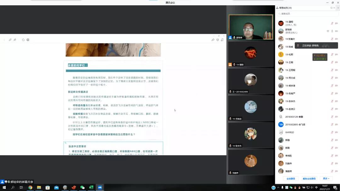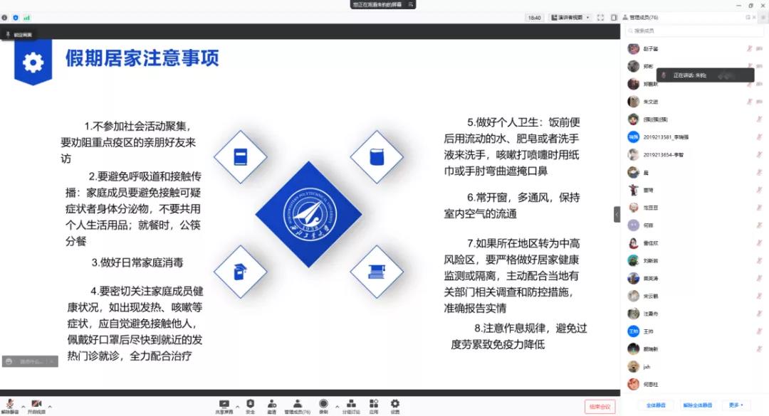 郭培荣副院长在班会中,针对学生寒假的留校离校注意事项作以讲解,提醒学生离校前一定要咨询好家乡所在地的防疫政策,提前收拾好自己的行李,不要遗漏自己的重要证件。此外他还为同学们讲解了新冠肺炎的传播途径,并在此基础上提醒同学们在返乡途中该怎样做好防护工作,提醒同学到家之后一定第一时间给班主任报平安。同学们认真听讲,有问题及时开麦提问,将注意事项牢记于心。