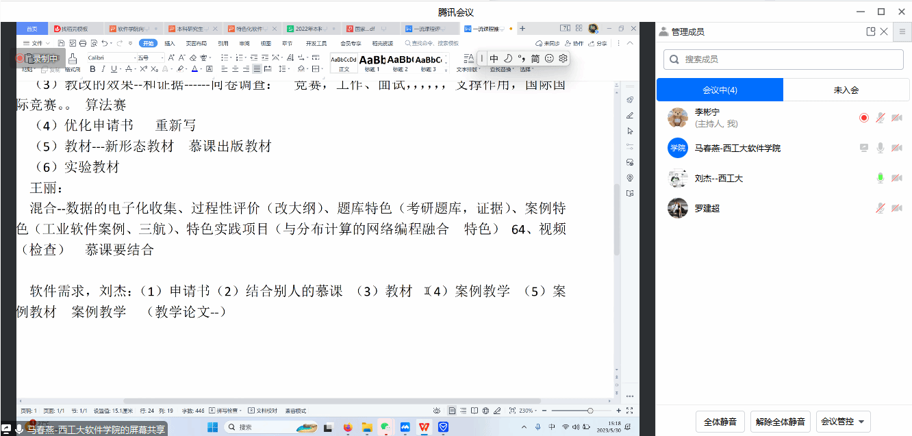随后,课程负责人分别汇报了所负责课程的建设进展,并就建设过程中碰到的问题,与会人员进行了深入交流和探讨。马春燕指出,各门课程要参照改进意见,对标一流本科课程建设标准,系统梳理存在差距,以时不我待的紧迫感,加快课程建设优化。