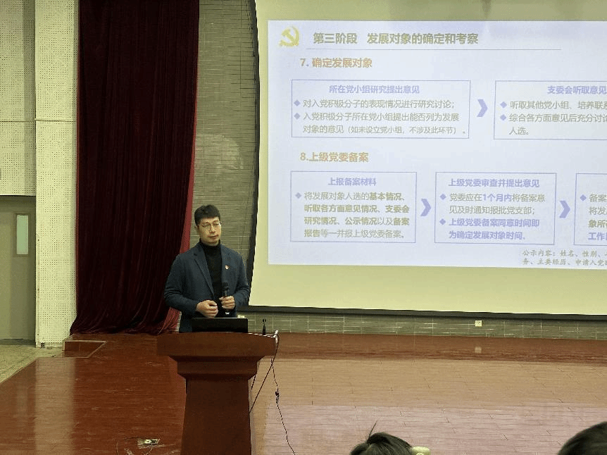 课程主要围绕发展党员工作中的基本程序和常见问题、主要材料的书写要求和注意事项、常见党建基础知识解答等内容开展。此次党课根据学生党支部党建工作实际情况,结合支部近年来发展党员档案流程中存在的问题,针对问题展开分析。