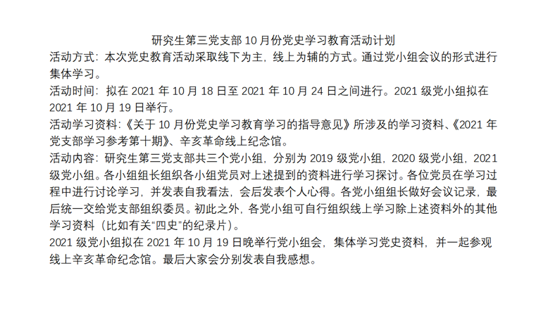 研究生第三党支部在校、院两级党委的领导下,积极响应党的号召,以习近平新时代中国特色社会主义思想为指导思想,牢固树立“四个意识”、坚定“四个自信”、始终做到“两个维护”。自2020年4月以来,在学校第二批党建工作“样板支部”培育建设过程中,支部认真落实创建工作任务,创新活动形式,努力打造党建工作新格局。