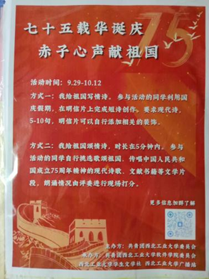 在这个金色的秋天,我们即将迎来一个特别的日子——祖国的生日。为了表达我们对祖国的无限热爱和崇高敬意,我们将举办一场主题为“为祖国献情诗”的诗歌活动。我们诚邀每一位热爱诗歌、热爱祖国的朋友,用你们最真挚的情感,最动人的词句,共同谱写对祖国的赞歌。活动期间,参赛者可以在指定地点领取特制的明信片,围绕“对祖国的爱”这一主题进行诗歌创作,诗歌形式不限,可以是现代诗、散文诗、古体诗等。活动结束后,校文学社组织评委团队,对所有提交的作品进行评审,根据其创意、情感表达和文学价值评选出最佳作品。此次诗歌创作赛道不仅是对创作能力的考验,更是对祖国深情厚谊的表达,弘扬爱国主义精神,增强校园文化氛围,让学生们在诗歌中表达对祖国的热爱和对未来的憧憬,彰显西工大学子的爱国精神。
