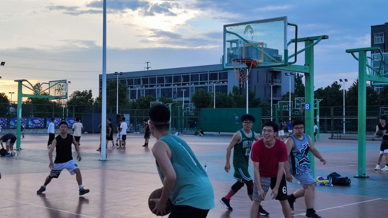 篮球场上,大家挥洒汗水,你追我赶,双方运动员都使出浑身解数,展开激烈争夺,比分交替上升,面对拦截,篮球选手们冷静应对,速攻快推,轻松化解了对方的攻势。比赛结束后,选手们手捧象征“2022年毕业快乐”的计分板在夕阳下合影留念。