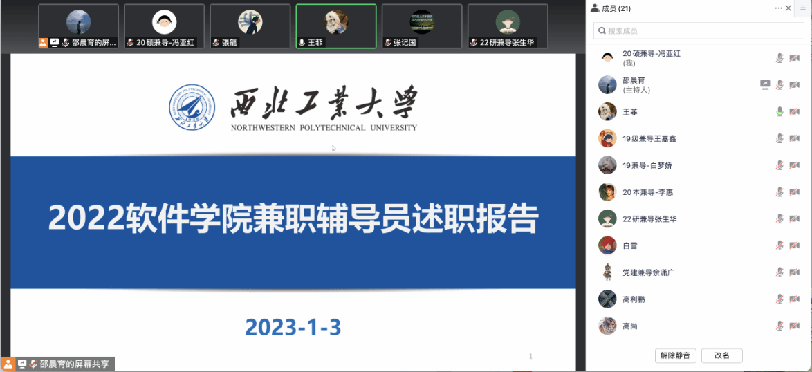 党委副书记(主持工作)李晗、党委副书记张龙、各专职辅导员、学生工作助理和兼职辅导员通过线上方式参会。会议由研究生学生工作助理王菲主持。