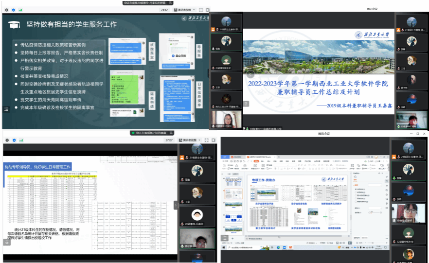 兼职辅导员管理制度、考核办法及注意事项。随后,与会各兼职辅导员分别就其思想政治素质、履职情况、工作实绩、未来规划等方面进行了精彩报告,参会评委对每位兼职辅导员的报告进行深入点评和交流。