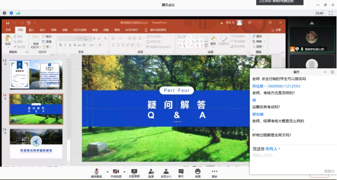 在肖老师对本次暑期国际学堂选课方式和选课时间进行介绍后,同学们积极参与互动问答,对课程的考察方式、授课语言等细节问题进行了踊跃提问。