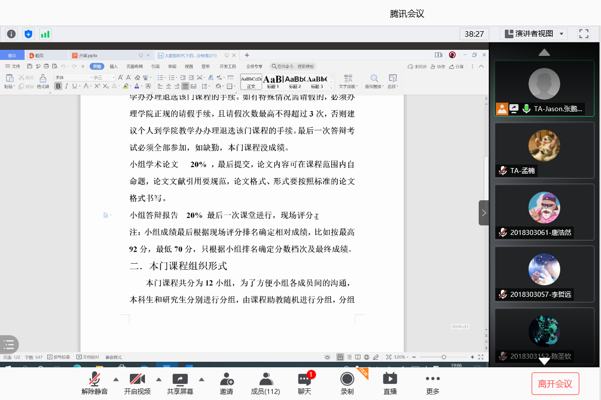 上课之前,助教对李教授做了简要介绍,接着对本课程内容和考核方式做了简要说明。紧接着结合本科选课人数较多及课程实际的需要,李教授建议将整个班级分成多个小组,作业均以小组形式提交,更好提升同学们的分工协作能力。与以教师主讲的传统课程不同,本次课程组织形式也是以学生为主导,每次上课要求小组汇报展示上节课作业,极大地锻炼了学生的表达能力。