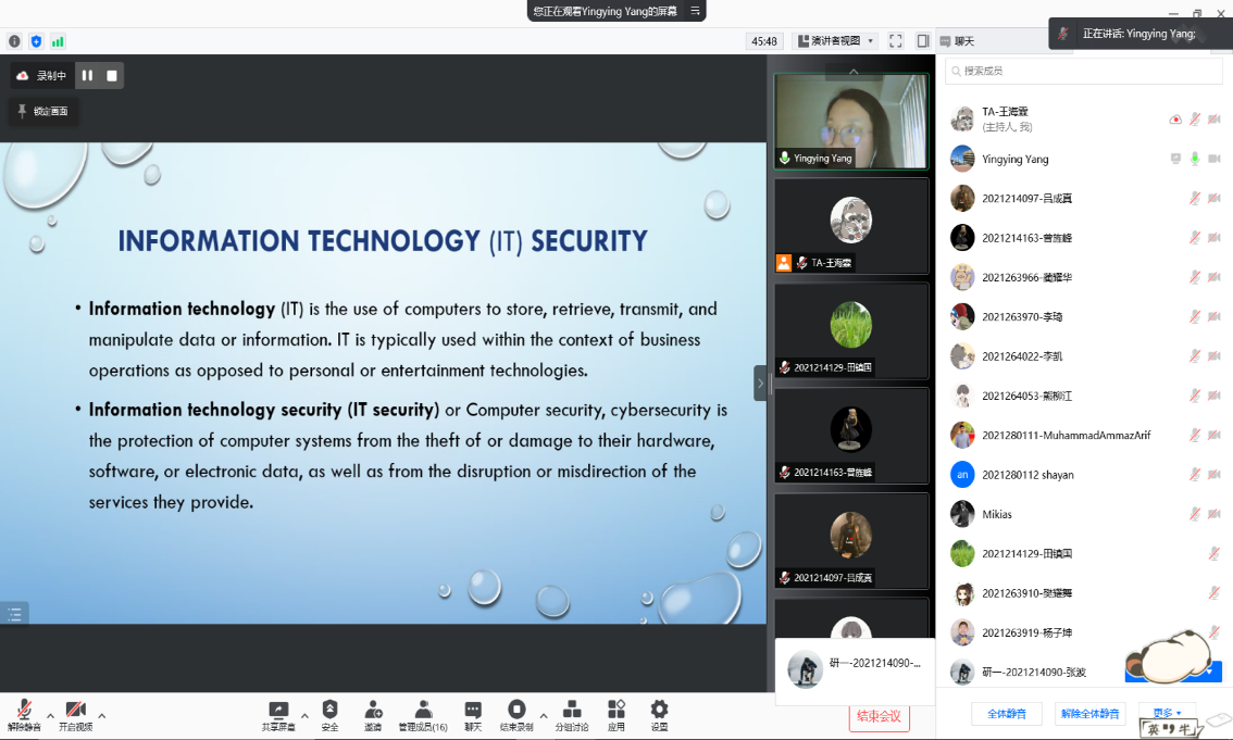 “网络信息与安全”(Network Information and Security)全英文外教课程顺利结课。本次课程特邀杨莹莹老师主讲,课程内容涵盖了网络信息安全相关概念,以及如何应对网络信息安全的相关挑战。