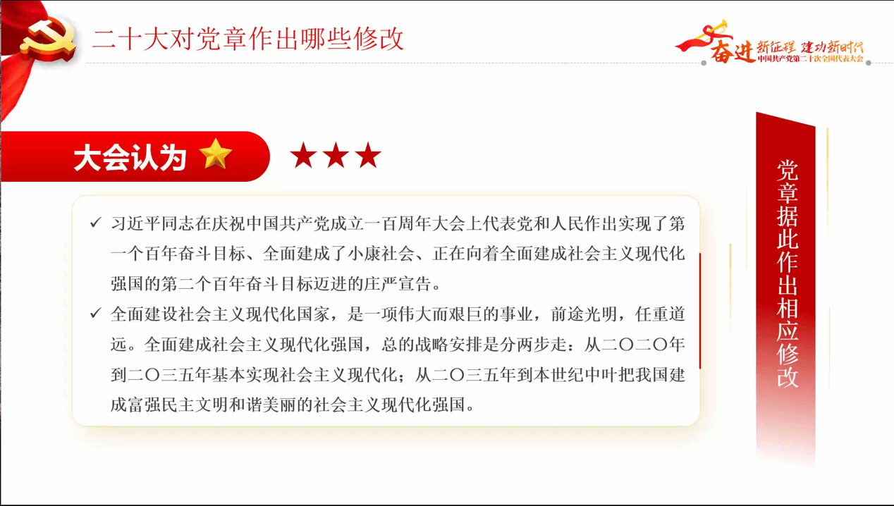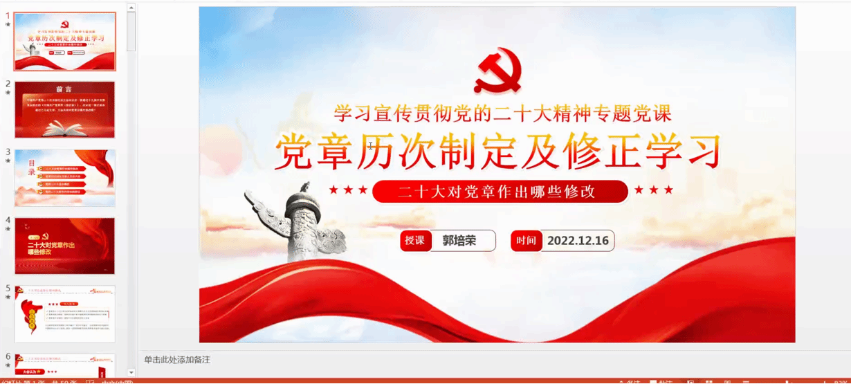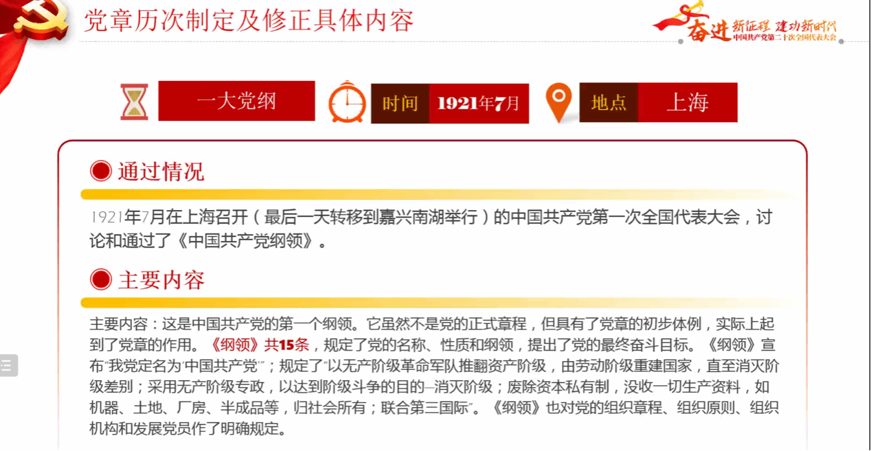 他对从党的一大到十九大对党章历次制定及修正的具体内容进行讲解,详细分享历次大会举行时间、地点、通过情况和主要内容。党章的百年演变反映了党章在新民主主义革命烽火中诞生并逐步成型,在社会主义建设道路探索中曲折前行,在改革开放和社会主义现代化建设中创新发展,在踔厉奋发的新时代中日臻完善的过程。