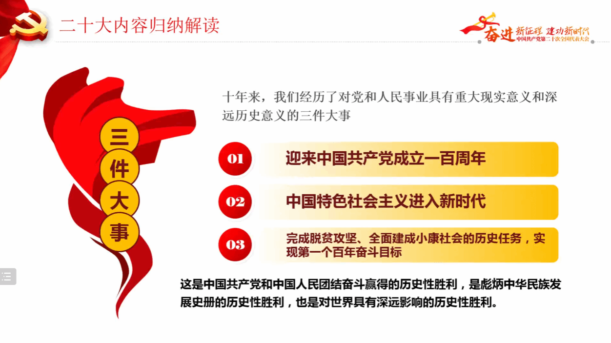 最后,郭培荣对党的二十大内容归纳解读,他强调中国共产党已走过百年奋斗历程,我们党立志于中华民族千秋伟业,致力于人类和平与发展崇高事业,责任无比重大,使命无上光荣。