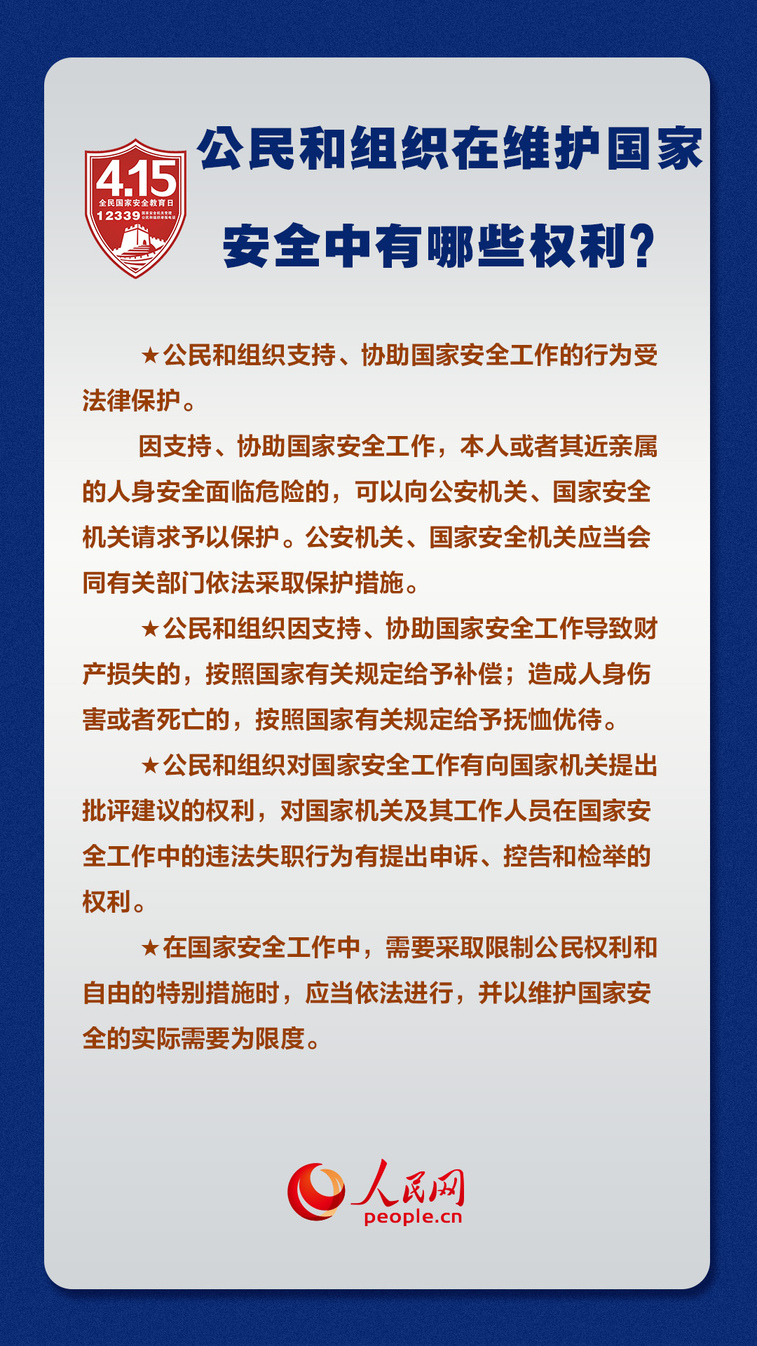 国家安全是指国家政权、主权、统一和领土完整、人民福祉、经济社会可持续发展和国家其他重大利益相对处于没有危险和不受内外威胁的状态,以及保障持续安全状态的能力。自觉关心、维护国家安全,是每个公民的基本义务,国家安全的真正实现有赖于人人参与、人人有可为。2015年7月1日生效的《中华人民共和国国家安全法》第14条规定,每年4月15日为全民国家安全教育日。