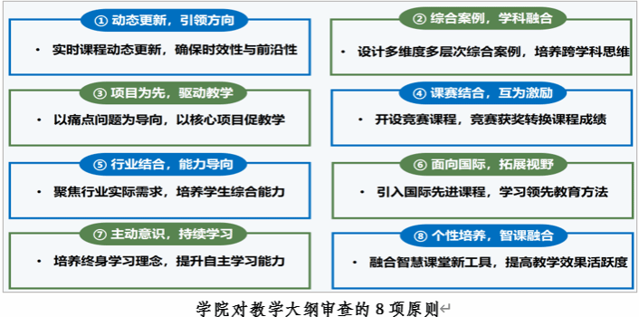 作为教学工作的核心文件,教学大纲的质量直接影响到教学设计的科学性、执行的规范性以及评价的公正性。鉴于此,学院对此次审查活动给予高度重视,采取课程负责人自我检查与学院专家组审查相结合的方式,对“互联网软件课程组”、“数据智能课程组”、“工业软件课程组”和“学科基础课程组”所涉及的50门课程教学大纲进行详尽的审查。学院制定了对教学大纲审查的8项原则,依据8项原则,重点审查教学内容设置的合理性、思政案例融入是否恰当、考核方式是否支撑教学目标、课程目标对毕业要求的支撑是否合理,以及与学校最新大纲模板的一致性等。
